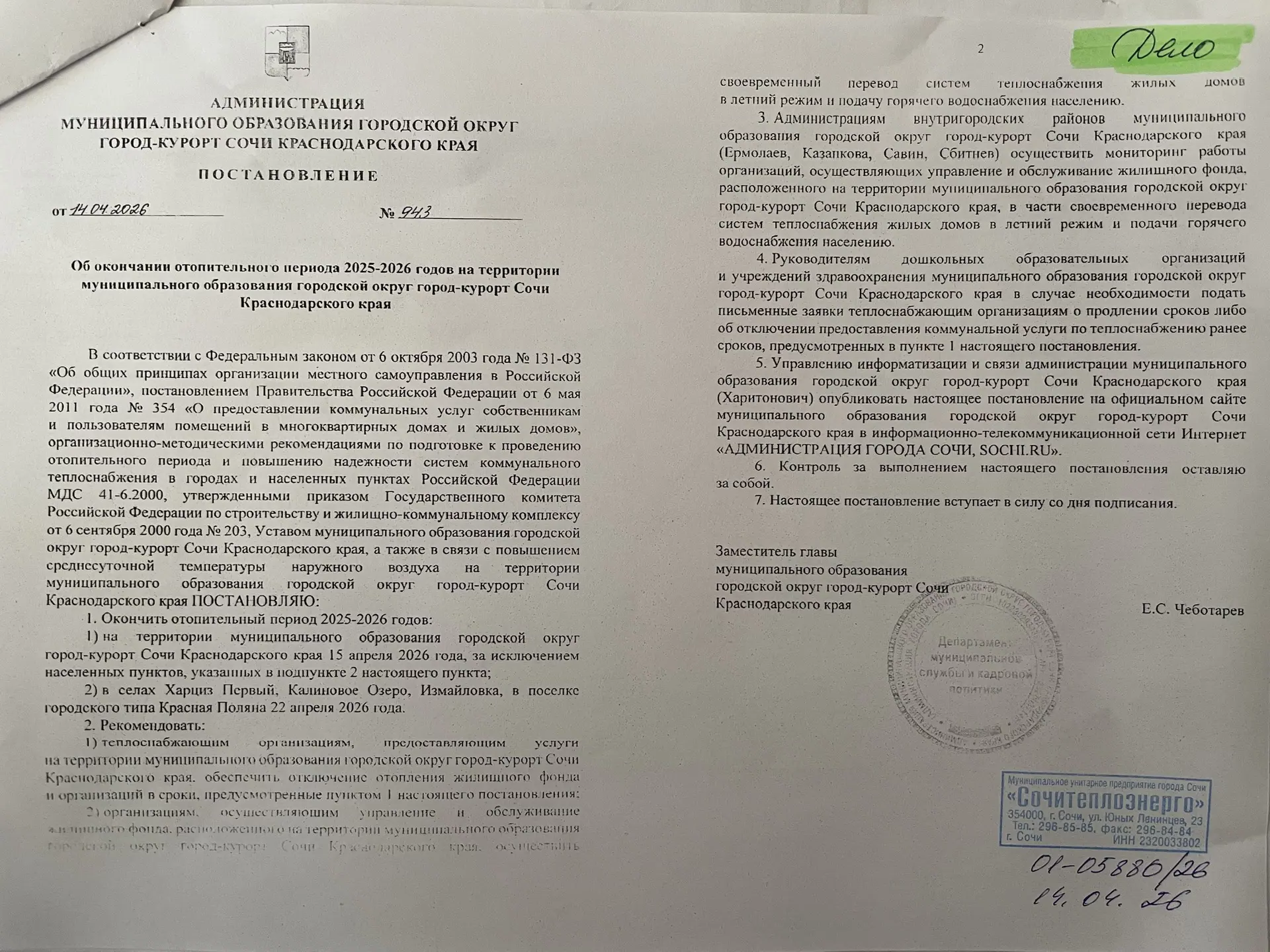 Согласно постановления от 14.04.26г. №943 «Об окончании отопительного периода 2025-2026г.» завершается отопительный сезон в городе-курорт Сочи